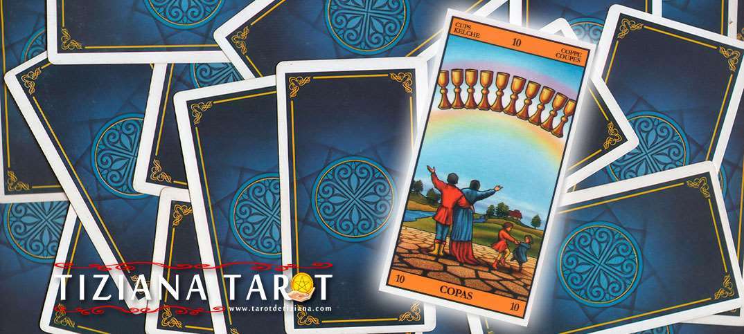 El Diez de copas encarna posiblemente una de las cartas más felices de toda la baraja de tarot, en donde el amor y la felicidad dominan la escena y todos los anhelos parecen haberse cumplido.