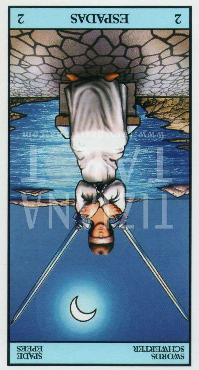 Cuando el Dos de Espadas se invierte, mantienen en parte las características que muestra en posición vertical, esto es, estar atrapados en un dilema o decisión importante.