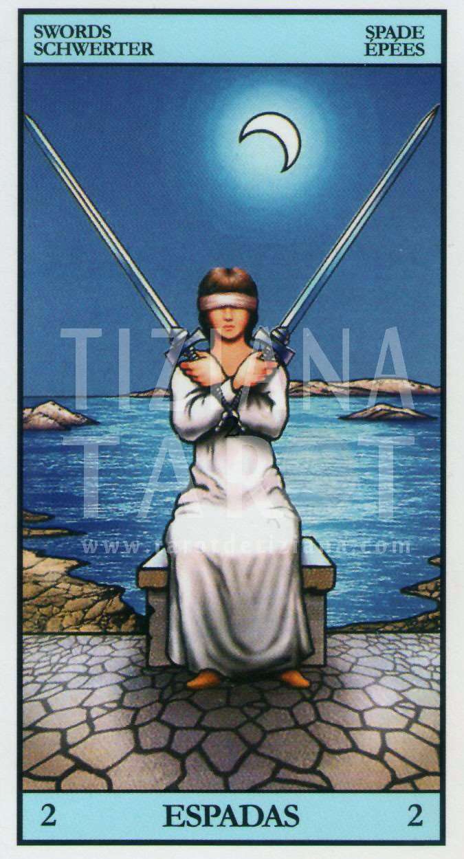 El Dos de Espadas señala que en tu estado de confusión actual, quizá puedas ser presa fácil de nuevas ideas o grupos que tratarán de captarte, atentos a tu visible debilidad emocional.