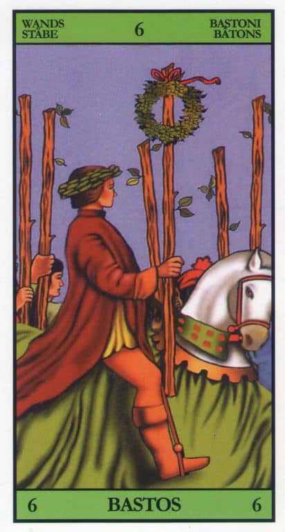 El Seis de Bastos aplaude una victoria y da la bienvenida a casa al héroe conquistador. Este es el desfile de bienvenida para los medallistas olímpicos, los sobrevivientes de la guerra, o el graduado.