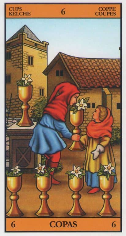 El Seis de Copas es una de las tarjetas más dulces de la baraja, con una imagen de niños jugando con dulzura y uno que conceden un regalo a otra.