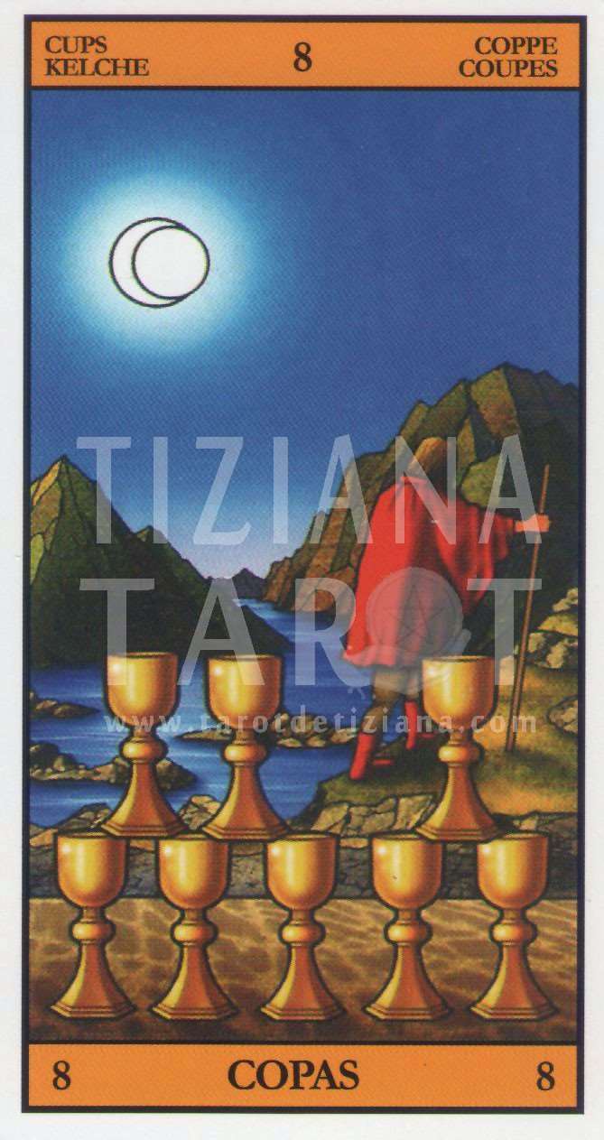 El ocho de copas puede indicar que tú has estado brindando y dando los demás mucho, consiguiendo poco o nada a cambio. Para no seguir lastimándote con estos resultados optas por un cambio bastante rotundo.