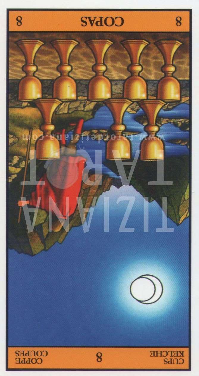 El ocho de copas puede indicar que es tiempo de que te preguntes en donde puedes hallar la satisfacción y un cierto sentimiento de felicidad que al parecer no te han brindado las distracciones, placeres y gozos del mundo material.