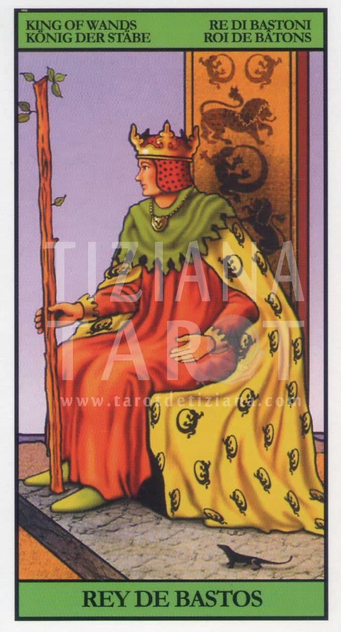 El Rey de bastos presenta similitudes con los restos de miembros de su corte, sota, caballero y su reina, pero a diferencia de estos, él encarna la energía poderosa del fuego puro. Él es la acción, él es el poder.