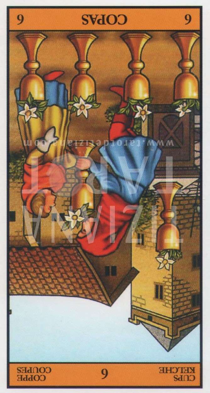 El seis de copas invertido puede señalar que ha terminado un tiempo de bondad, de mirada color de Rosa sobre el trabajo y su entorno. Ciertas cosas negativas, defectos e inconvenientes que no habías tomado en cuenta se hacen evidentes ahora. Es un baño de realidad.