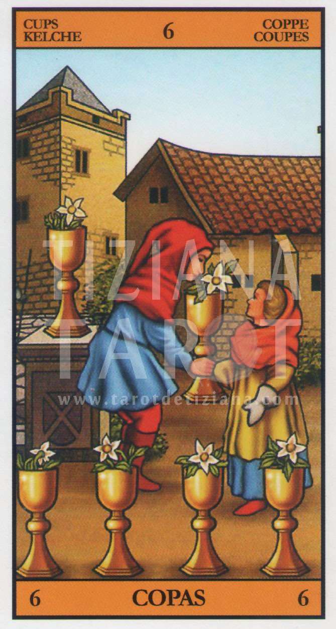 De esta unión se desprende que el seis de copas nos habla de los pasados felices, sobre todo en tiempos de la infancia en donde nuestra generosidad y nuestra inocencia no estaban aún contaminadas.