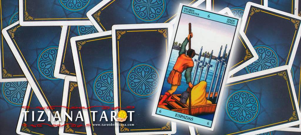 El Seis de Espadas nos muestra en la figura una barca llevando una mujer y un niño, en actitud de estar alejándose de algo. Si bien a primera vista hay una sensación de pérdida, esto no es así.