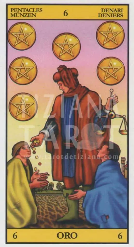 Si por el contrario, eres uno de los indigentes de la figura en el Seis de Oros, esta carta anuncia que puedes ser bendecido y beneficiado con la ayuda de otros o de una persona en particular. Esto te hará salir del paso o te dará una solución a largo plazo, lo cual es muy bueno, y luego podrás devolver de alguna manera el favor recibido.
