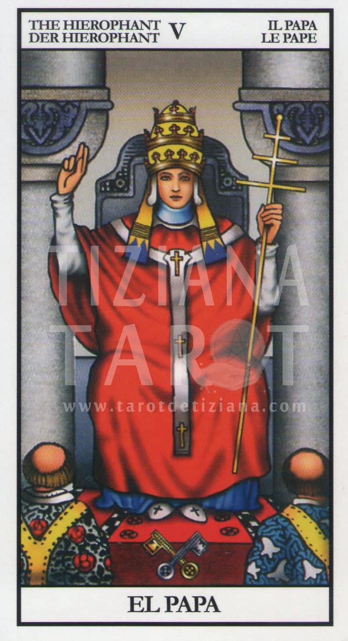 ¿Qué hacen las llaves? Ellas desbloquean las puertas. Las llaves de la carta del Hierofante presentan dos llaves, una llave de oro y otra de plata cruzadas, que es un emblema papal de autoridad y se traduce en el sentido de las “llaves del reino de los cielos.” Como tal, el Hierofante o Papa es una autoridad, y el titular de las llaves del reino, es decir, una figura intermediaria o traductor entre Dios y el hombre. Las llaves también simbolizan un equilibrio entre lo consciente y el subconsciente y el poder de abrir y desentrañar los misterios del velado inconsciente.