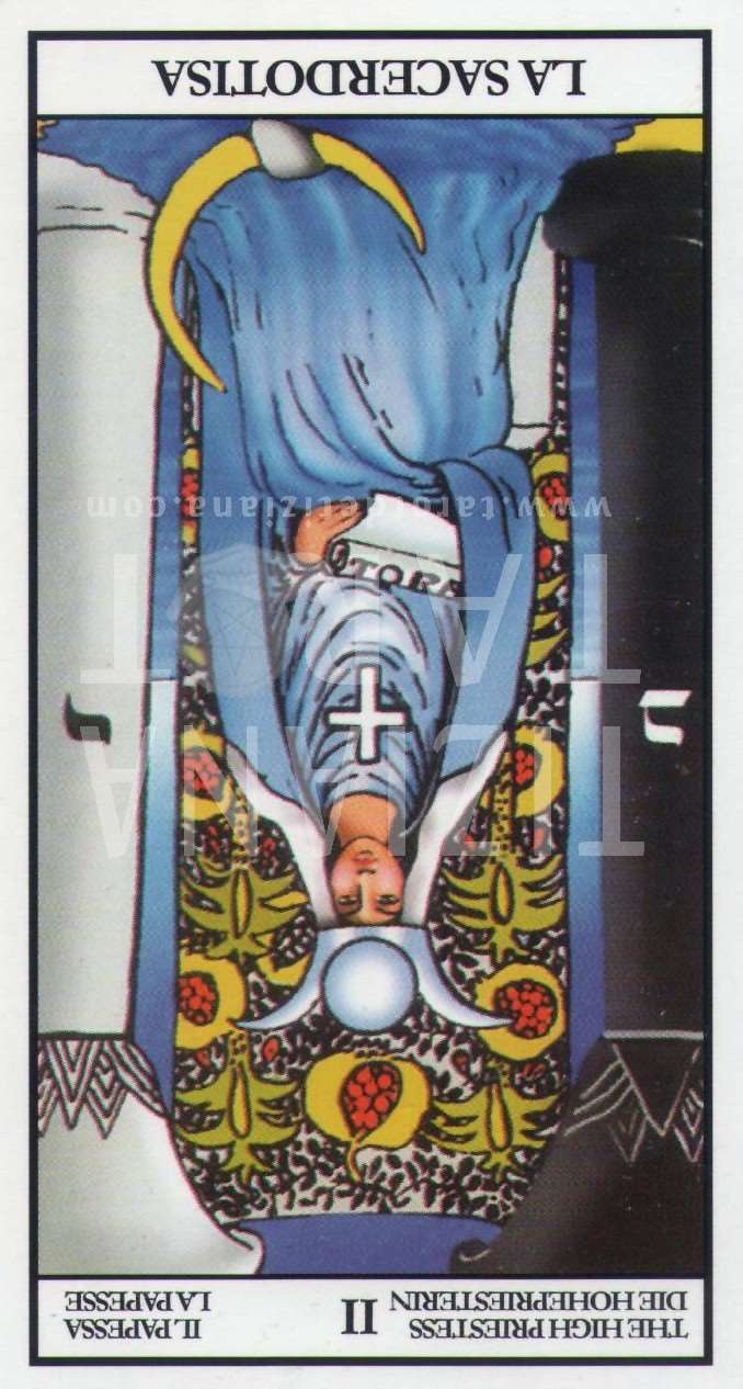 La Sacerdotisa presenta dos mensajes distintos según sea la posición en que ha salido. La sacerdotisa al derecho es la Intuición, los más altos poderes, el misterio, la franja subconsciente de la mente.