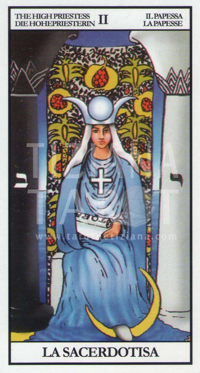 En la imagen de la carta se observa que la Sacerdotisa se sienta de espaldas a las puertas del gran misterio universal, custodiando su entrada. Vemos en el fondo, tras la puerta, el gran árbol del conocimiento, el árbol de la vida, repleto de frutos.