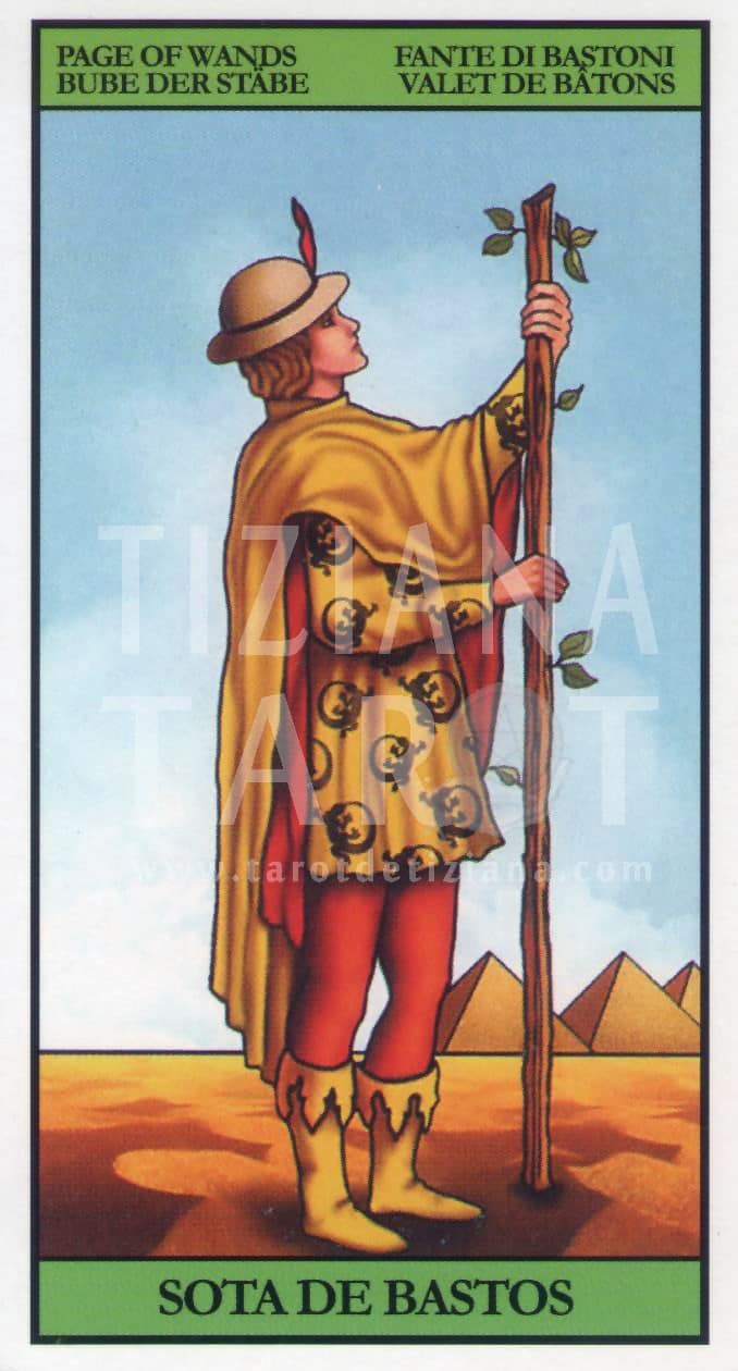 Esta sota al igual que las otras y que en general todas las figuras de la corte (sotas, caballeros, reinas y reyes) que son siempre una suerte de mensajeros, ya sea con una noticia que llega a ti o un consejo sobre como debes actuar, esta carta del paje de bastos es posiblemente un anuncio o noticia que llega a ti, positiva la más de las veces, que pueden inspirarte o alentarte, o cuanto menos darte buenas nuevas que no esperabas y te agradará recibir.