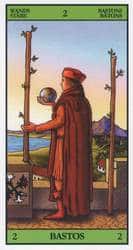 Los bastos son carta de acción, y con el Dos de Bastos estamos hablando de grandes planes, aquí se trata de soñar en grande y ver lo que es realmente es posible de que puedas realizar, por lo que la planificación en tu nuevo inicio es muy importante. Tú pones la acción, pero también debes planificar, y si lo haces el éxito te espera con los brazos abiertos. Si te falta coraje para dejar tu zona de confort, esta carta te apoya en todo. Planifica, ejecuta, sal y conquista tu nuevo mundo.