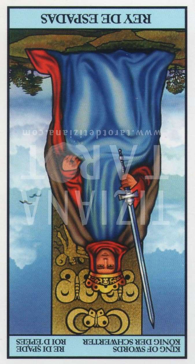 El Rey de Espadas ejerce un poder significativo. A menudo se encuentra en una posición de autoridad y usa su estatus y su gran intelecto para buscar los resultados que le convengan. Invertida señala que esa no es una buena persona para tener a tu alrededor. Es alguien abusivo en su poder, tiránico, y busca arrodillar a cualquier persona que amenaza su posición de autoridad y control. Puede que sea una, un jefe, un padre o figura paterna, y él está aquí para hacerte la vida muy difícil.