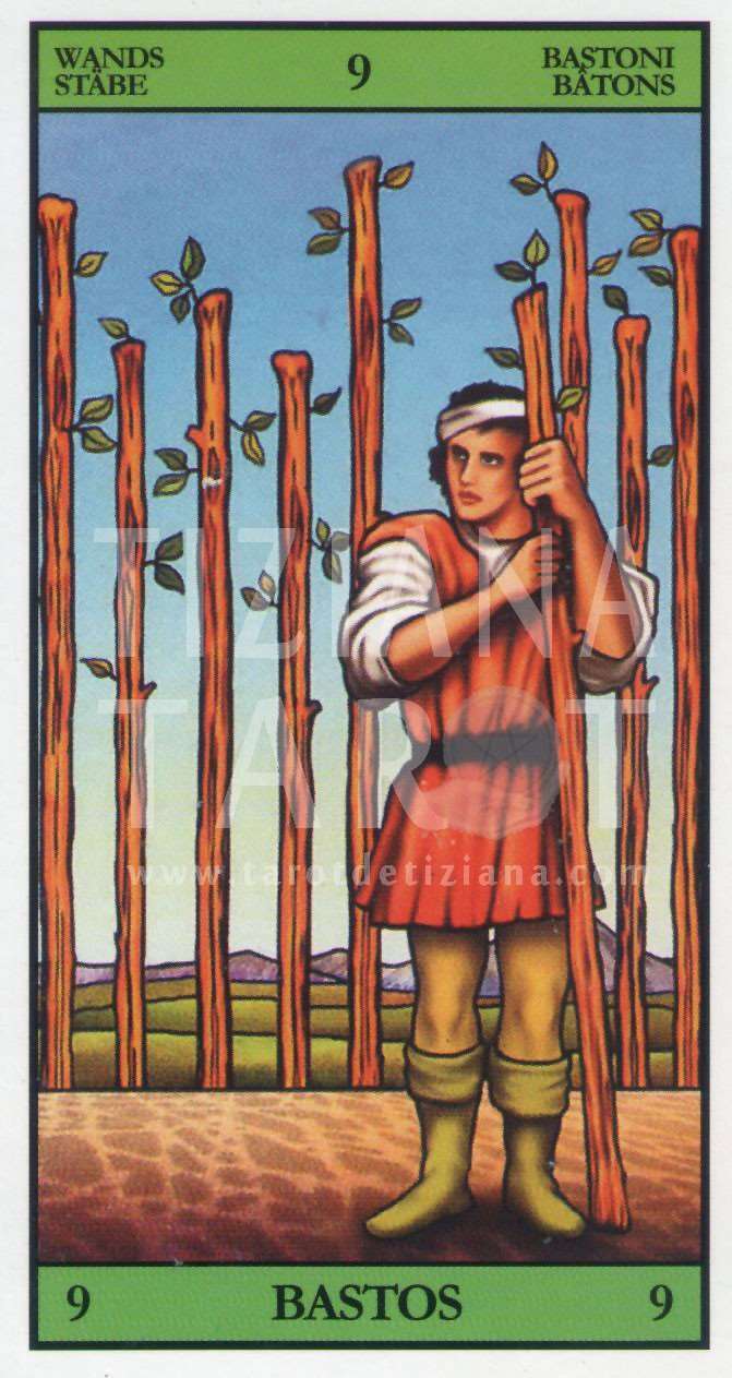 En el Nueve de Bastos, se ve a un hombre con una venda y magullado, pero en lugar de quedarse o sentirse derrotado, él se mantiene firme y se defiende a sí mismo. Esto puede indicar abuso físico o emocional, pero también significa que la víctima está de pie por sí misma y no va dejarse sofocar ni dominar por el abusador. Puede ser una de esas relaciones abusivas donde la mujer es quien es dominante y ejerce el abuso o violencia sobre el hombre.