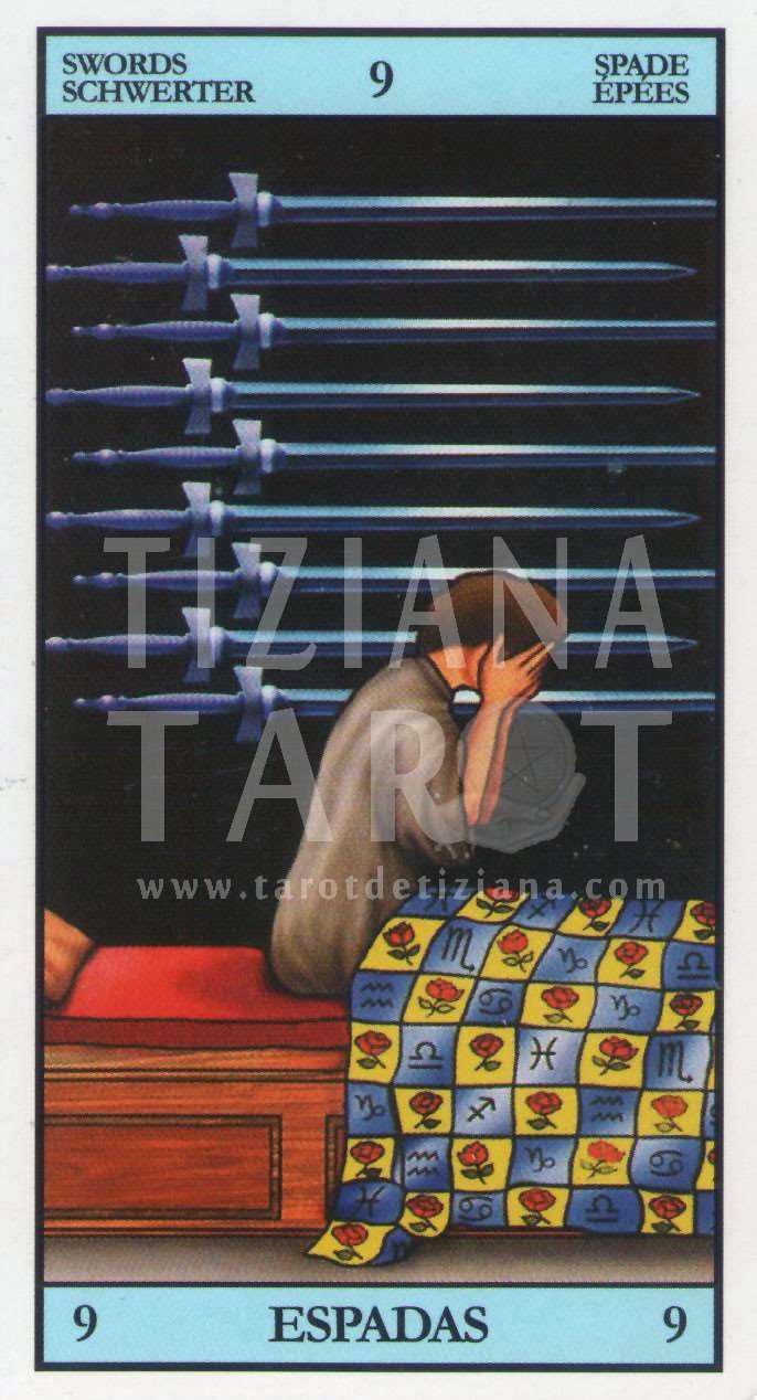 El Nueve de Espadas muestra a una mujer, tomando la cabeza en sus manos, sentada en su cama. Ella parece estar muy angustiada y atormentada por sus pensamientos y su situación. Esto puede señalar a alguien que está bajo maltrato o intimidación, de larga data y recurrente, por lo general abuso emocional o psicológico más que físico. Esta persona puede haber sido amenazada en varias ocasiones y está muy temerosa por su bienestar.