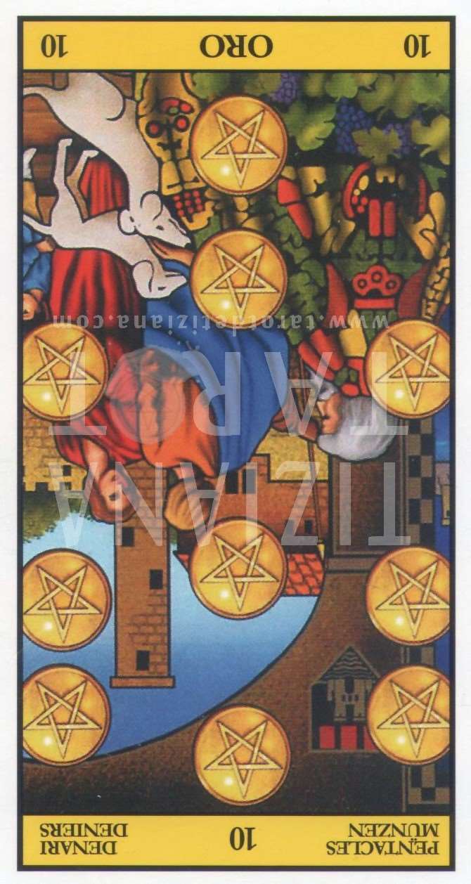 El Diez de Oros refleja una relación establecida y consolidada, un matrimonio a largo plazo junto con una extensa red familiar. Invertido, este matrimonio puede estar llegando a su fin y ahora están teniendo que vender activos familiares y separar sus finanzas como parte de la ruptura. La familia y la vida familiar se ven afectadas también. Suele aparecer para señalar el fin en relaciones de muchísimos años, cuando los hijos abandonan el nido o se llega a una etapa avanzada en la vida en que se comprende que queda poco tiempo y se necesita vivir de otra manera.