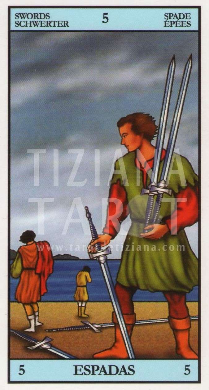 El Cinco de Espadas muestra que la batalla se ha luchado y se ha perdido. Tal vez tú has estado pasando por un largo período de desacuerdos y discusiones con tu pareja y, finalmente, has decidido ir por tu propio camino. Mientras que la discusión ha terminado, puede que no tengas el cierre o la ‘última palabra’ que estabas buscando. En lugar de empujar las cosas, es el momento de dejar ir.