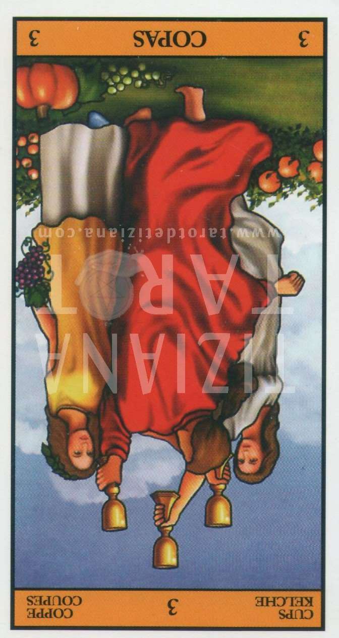 En esta carta vemos un corazón atravesado por tres espadas. Esta carta indica sin dudas dolor, angustia y tristeza. Esta tarjeta puede aparecer mostrando el doloroso final de una relación, especialmente relaciones recientes o nuevas, que se iniciaron con gran ímpetu e ilusión. Afortunadamente también se ve que el sol que brilla detrás de las nubes, lo que sugiere que esta angustia es sólo temporal y que pronto te repondrás de esta dura experiencia.